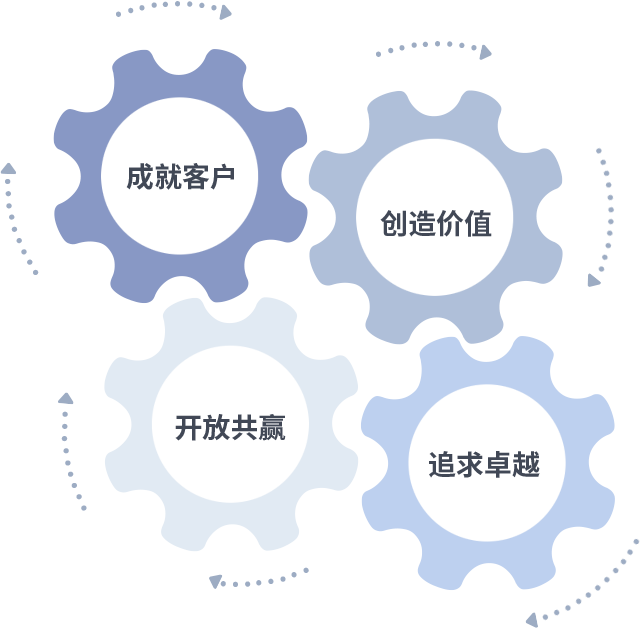 成就客户是一切决策的出发点,创造价值是衡量所有工作的标准,追求卓越是众腾娱乐做事做人的态度,开放共赢是众腾娱乐的格局也是最终的结果。价值观的齿轮环环相扣,推动着组织里的每个人不断向前。